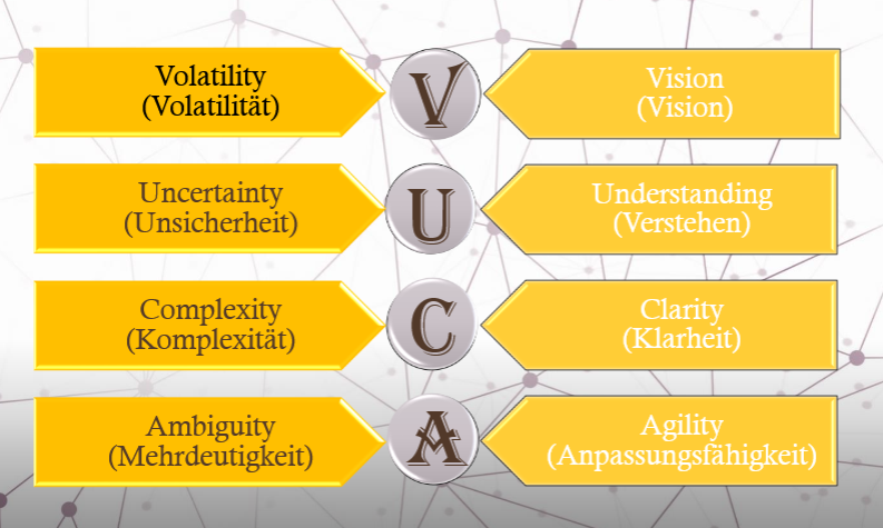 - Volatility (Volatilität), die ständigen und immer schnelleren Veränderungen unserer Zeit.
